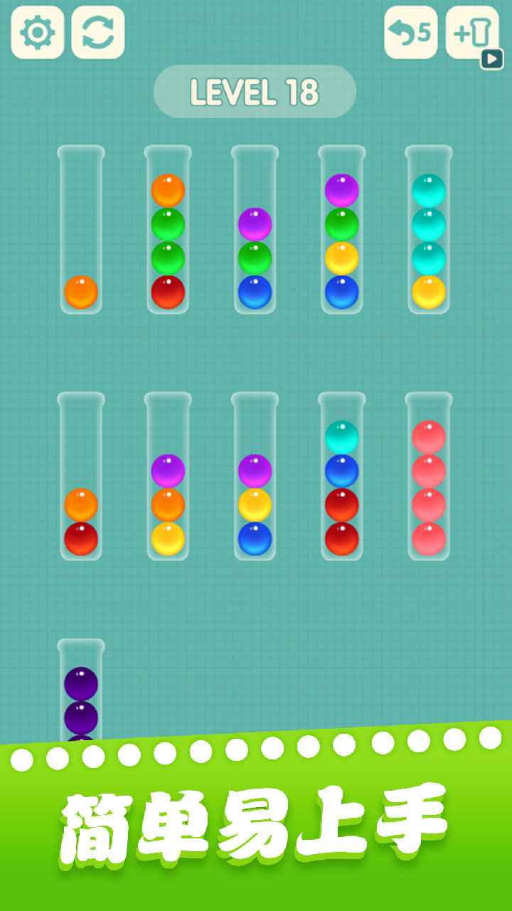 核心玩法围绕颜色分类展开,玩家需要通过拖拽操作将散落的彩色球球移动到对应颜色的瓶子中。随着关卡推进,会出现更多颜色组合和特殊球球类型,如会弹跳的橡胶球、需要特定顺序激活的魔法球等,不断丰富游戏体验。