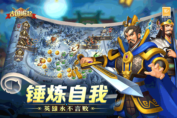 2、简约的游戏系统,以挑战闯关为核心的系统设计,游戏界面仅有征战、布阵、抽卡、点将、军营5个栏目,没有任何繁杂无聊的剧情任务