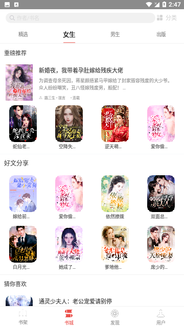 精选书籍:精心策划女频、男频、出版、免费等多个特色书单,满足不同读者的多样化阅读需求。