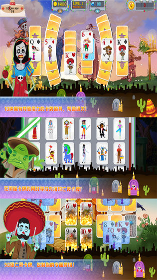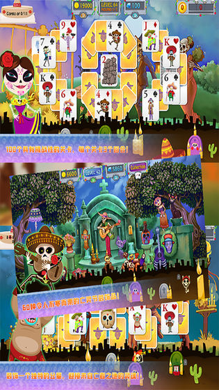 亡灵节纸牌中你需要在游戏中装饰墓地欢迎来自死者之地的灵魂;游戏还包含超过35张收藏卡,你可以定制你自己的卡牌;还有100挑战级别与3轮卡- 300独家布局,增加挑战的许多障碍。