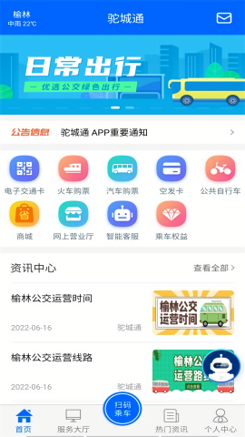 5、驼城通是专为榆林人制作,软件拥有乘车码,公交站点,在线充值,交通资讯等诸多功能服务,可以帮助用户更轻松便捷生活出行