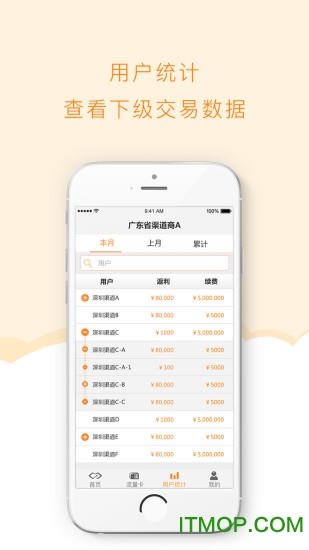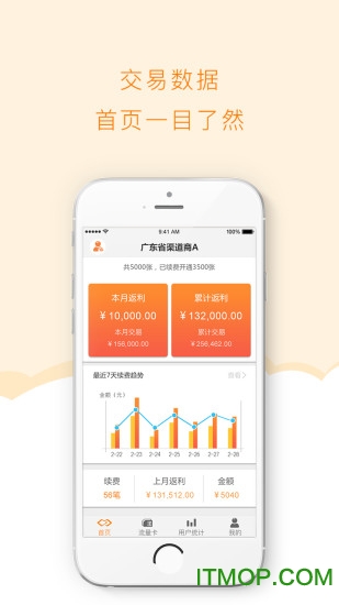3、麦联宝,一站式物联网流量虚拟平台管理工具;交易数据,首页一目了然;流量卡查看,单卡点对点分析用户统计,查看下级交易数据;用户充值查询,流量管理快速便捷