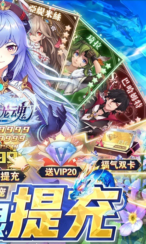 豪华新手礼包:注册即送VIP20特权、百万战力专属称号、稀有道具大礼包、500元余额卡和至尊龙主2等超值奖励;