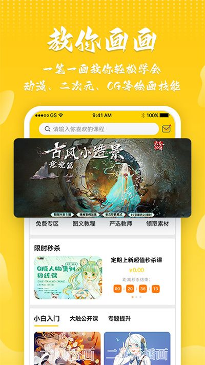 ●专业系统:平台构建了完善的课程体系,包含美术基础、软件入门、板绘技巧、各类插画风格等专业课程,通过循序渐进的教学方式帮助学员全面提升绘画水平。