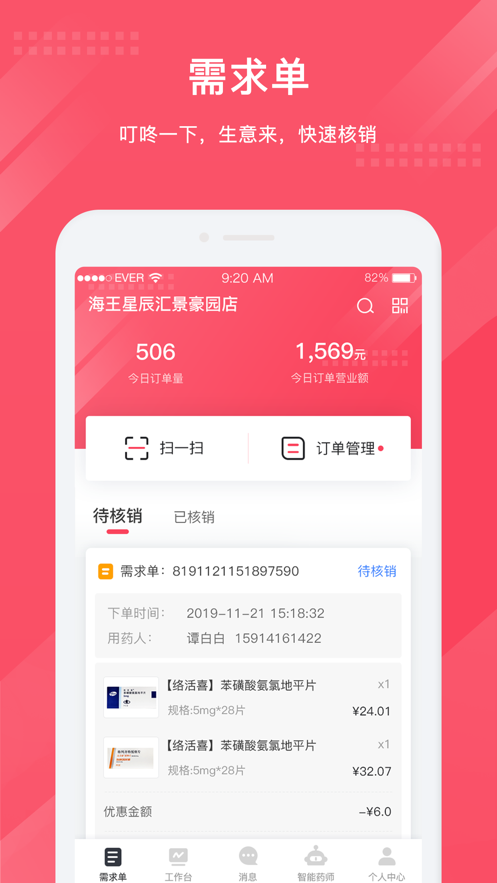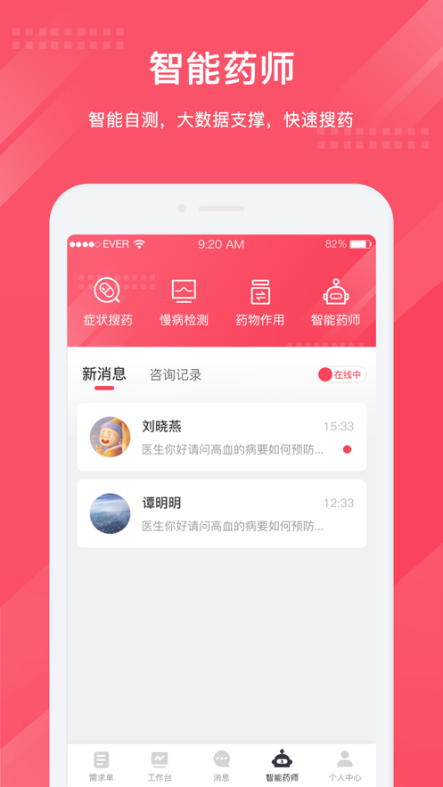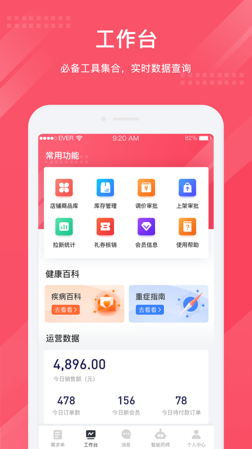 3、智能药师是一款面向商家、药师、用户的专属移动工作台,提供接单、库存管理、营销、数据、智能药师等多样化服务