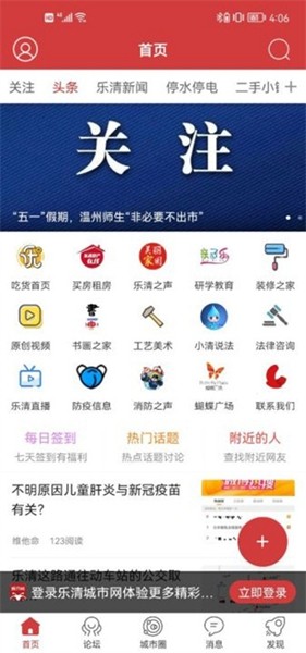 首次进入乐清城市网app,您可以在首页看到各类头条新闻,以及买房租房、法律咨询等实用服务入口。论坛板块让您可以与本地网友交流讨论,汽车爱好者可以关注"城市网说车"专栏。在城市圈中,您可以浏览同城好友分享的生活动态,也可以自己发布内容。通讯录和消息中心让您随时查看好友动态和系统通知。发现页面提供公交实时查询等实用功能,让您的出行更加方便。