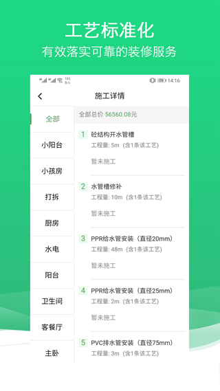 进入报价详情版块,查看不同空间和工种的报价信息,了解总工程价格
