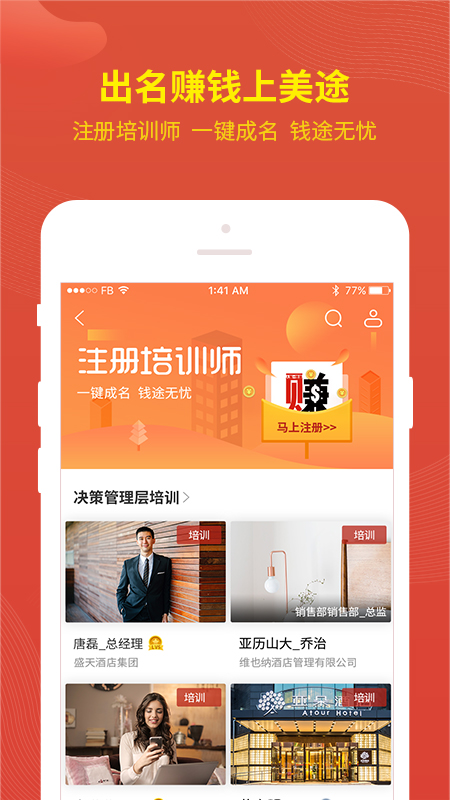 2、上美途app,让酒店经营更简单;酒店行业的今日头条和百度,没事看一看,有事搜一搜;出名赚钱上美途,注册培训师,一键成名,钱途无忧;赚钱省钱,自由轻松,滴滴”一响,人财俱来;展示智慧的舞台,名师在线“百病”俱除