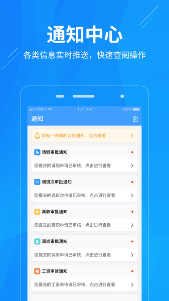 移动审批管理:支持员工通过手机随时随地提交请假、出差、加班等各类申请,同时可实时查询审批进度,真正实现无纸化办公。