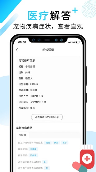 3、查看宠物以往历史问诊记录及病例,通过详细的宠物疾病症状快速定位病状
