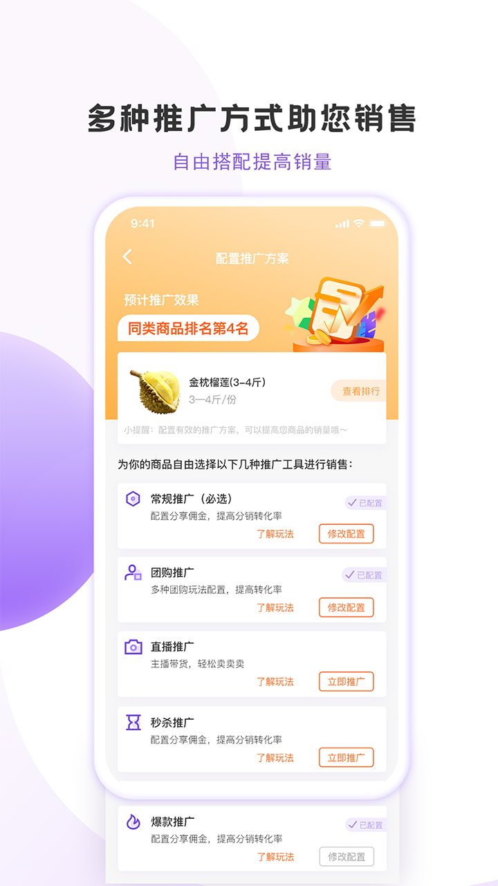 2、具备多种推广工具,常规的、团购的、直播的和秒杀的、爆款的推广工具这里都有