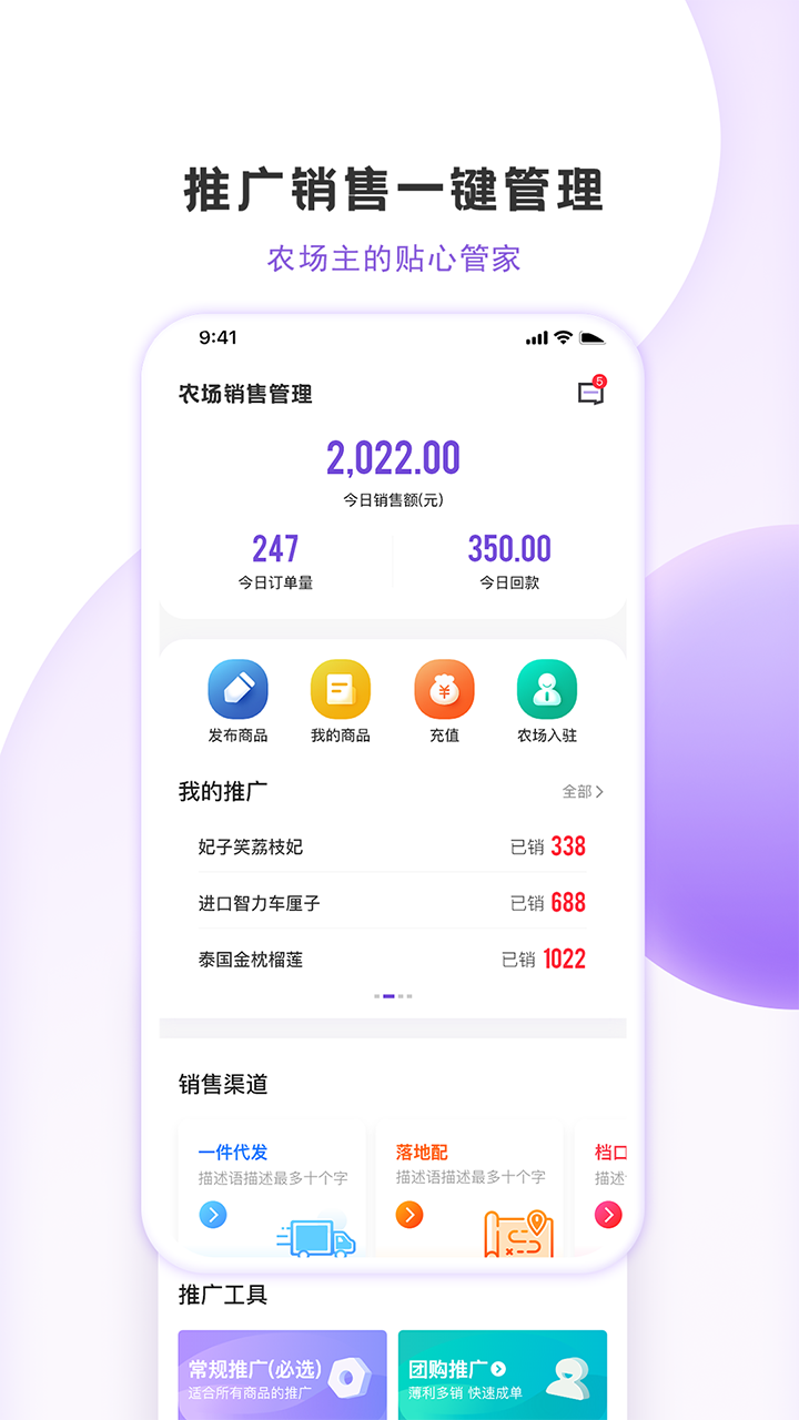点筹APP是一款专为农场主量身打造的智能化销售管理系统,致力于为农产品经营者提供全方位的数字化解决方案。通过创新的营销工具和精准的数据分析,帮助用户轻松拓展线上销售渠道。平台整合了商品管理、营销推广、数据分析等核心功能,让农场主能够高效管理产品库存,实时追踪销售数据,并根据市场反馈快速调整营销策略。无论是小型家庭农场还是大型农业企业,都能在这里找到适合自己的销售模式,实现农产品价值的最大化。