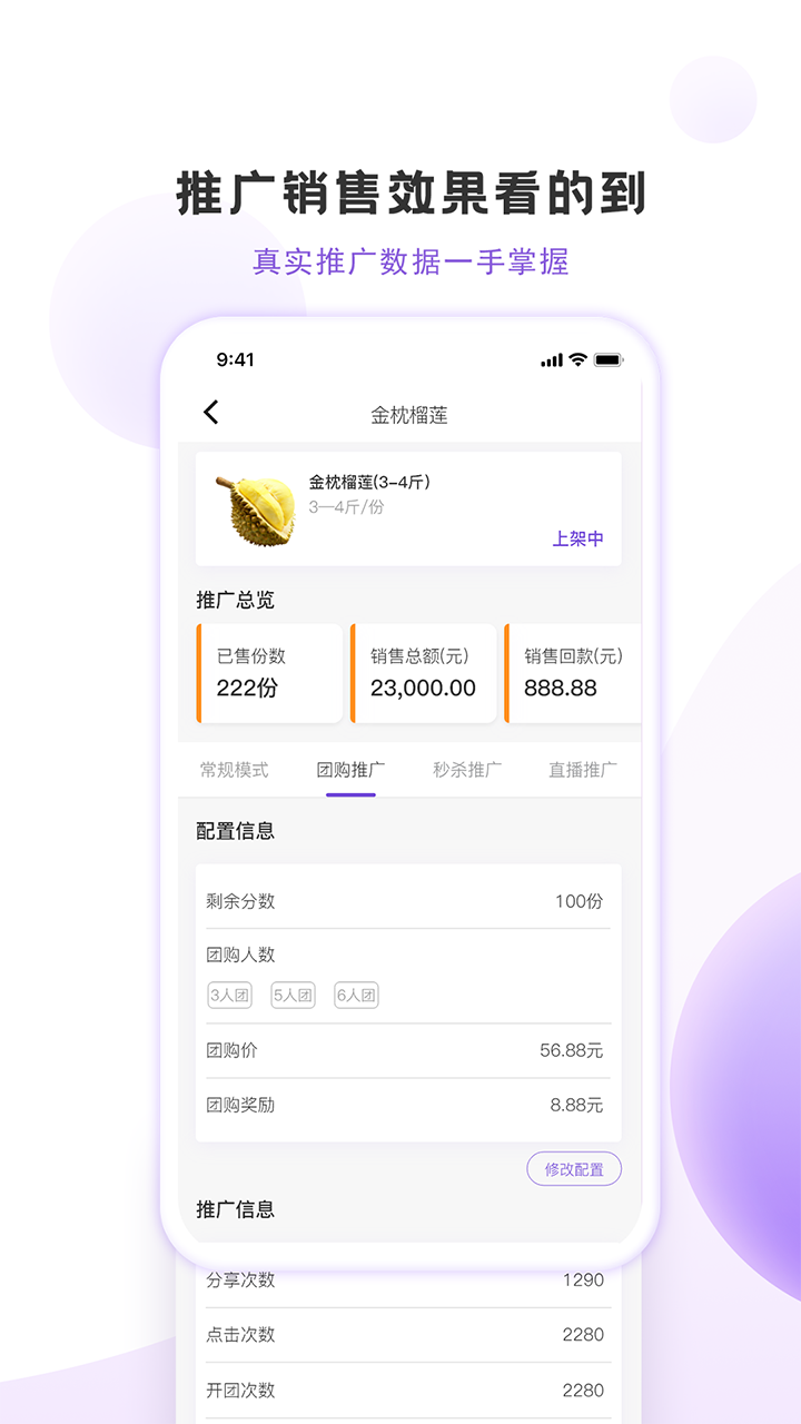 通过设置团购佣金,将被动的分散购买变成主动的团购裂变,带来超强的销量转化。系统支持多级分销设置,让每个消费者都成为您的销售员。团购进度实时显示,刺激用户快速成团。