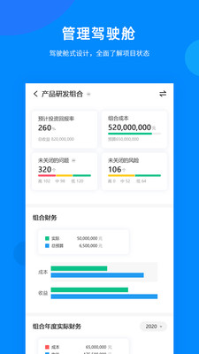 采用驾驶舱式可视化设计,通过直观的数据图表全面展示项目状态,帮助管理者快速决策