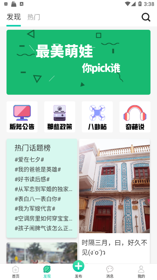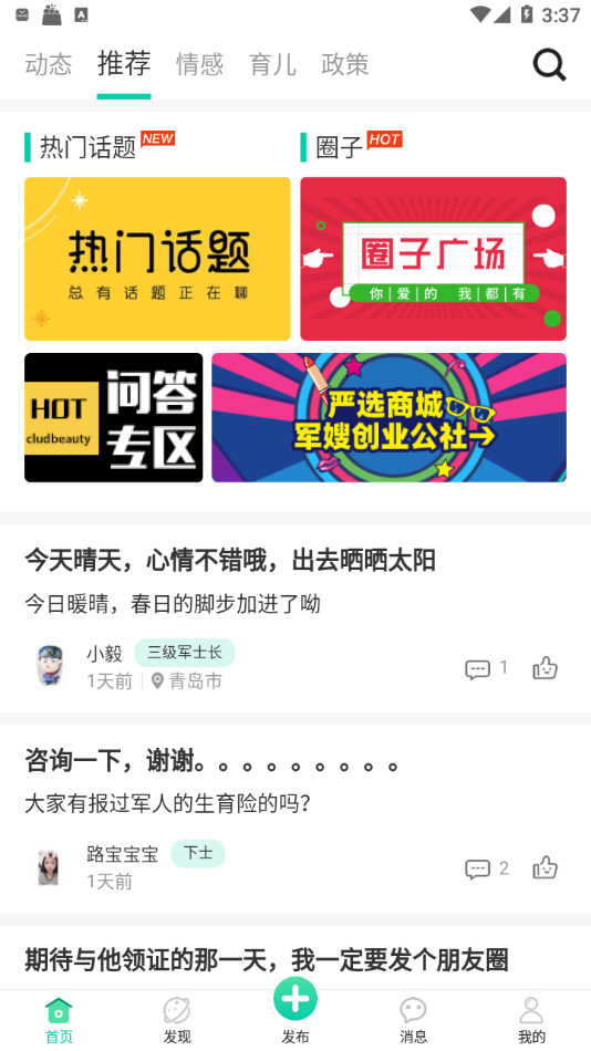 实时更新最新话题,参与热门讨论,发现志同道合的军嫂朋友,拓展社交圈