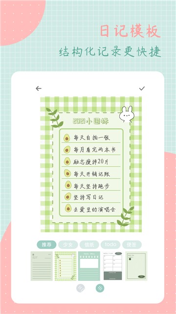 3、各种各样的背景、字体、贴纸、模板等,丰富用户写日记的体验
