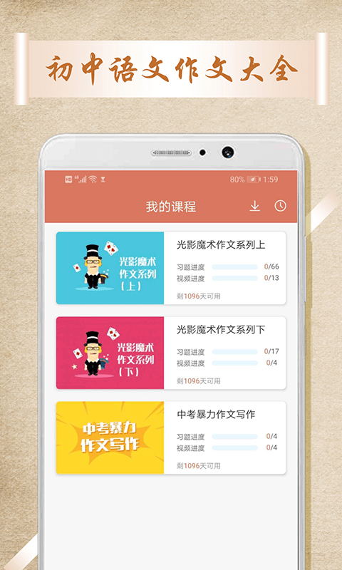 v1.0.0版本作为初始版本,已经包含了九年级初中作文专项训练和初三中考语文冲刺的完整内容。软件收录了全国各省市版本(包括人教版等)的精品视频课程,提供多种定制化学习方案,特别包含中考暴力作文写作和光影魔术作文系列(上、下)等特色课程,满足不同学生的学习需求。