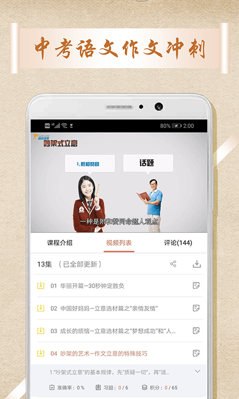 1、中考语文作文是一款非常棒的与语文作文学习软件。软件帮你冲刺中考,丰富的各种课程轻松学习。各种作文题目轻松预测,海量类型作文素材任你来学。你还在等什么?快来下载吧