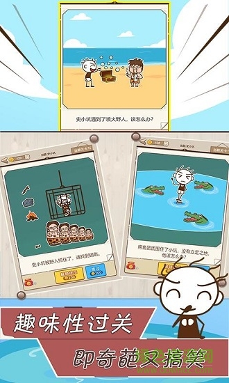 漂流记是一款充满趣味与挑战的荒岛生存解谜游戏。玩家将跟随倒霉又乐观的主角史小坑,开启一段笑料百出的荒岛求生之旅。在这个充满未知的岛屿上,你需要帮助史小坑解决各种奇葩难题,从寻找食物水源到躲避野人追击,每个关卡都暗藏玄机。游戏采用独特的问答+操作玩法,上百个精心设计的关卡将考验你的脑洞和反应能力。轻松诙谐的画风搭配无厘头的剧情,让整个冒险过程充满欢乐。快来体验这场别开生面的荒岛漂流记吧!