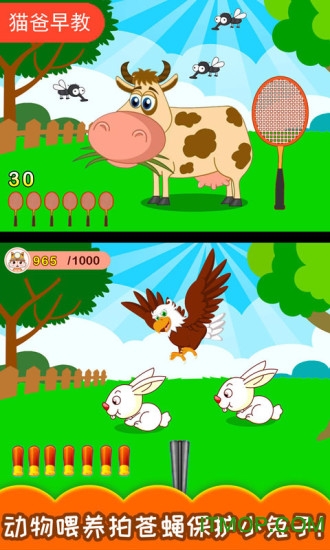 4、动物管理:动物管理小游戏,帮兔子逃脱老鹰追捕、帮奶牛驱赶蚊子;