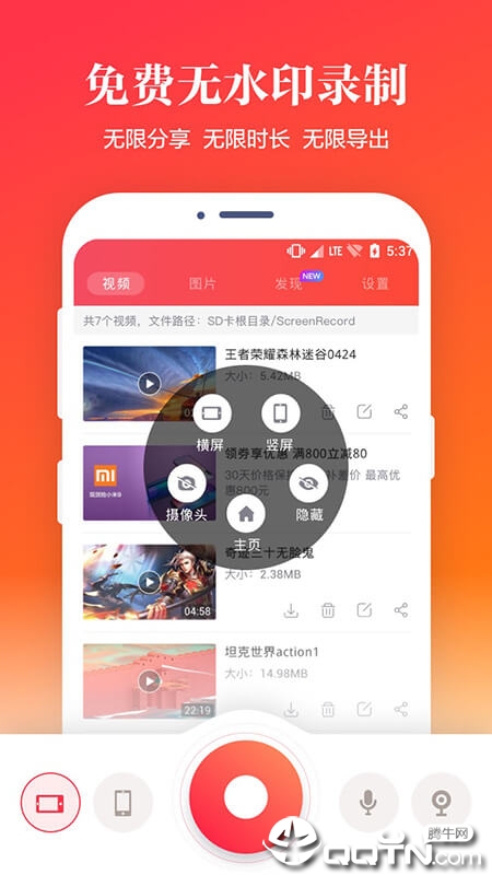 4、苹果录屏app是一款安卓手机录屏软件。无需ROOT,各种游戏、教学视频、直播节目等一键录制,小白也能做出属于自己的高清视频,快来下载体验吧