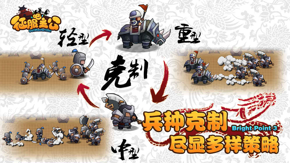 游戏中的战斗核心在于兵种的相互克制,兵种大体分为轻型、中型和重型,环环相扣,相互克制,合理选择出兵时机和武将技,将是一场战斗的胜负关键。战斗中还加入了士气系统,连续获胜可以提升全军属性,而溃败则可能导致连锁反应。