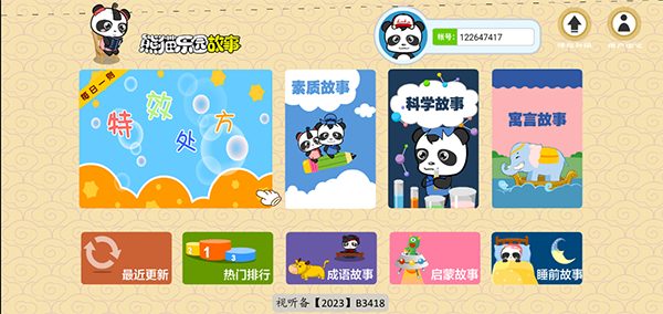 2、熊猫乐园故事是一款专为儿童打造的教育软件,在这里以熊猫乐园等一系列故事,以动画形式来教育孩子,帮助孩子养成良好性格和习惯