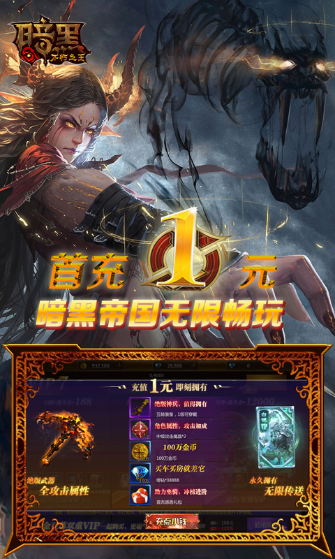 《暗黑:不朽之王》是一款基于经典暗黑破坏神IP打造的魔幻题材MMORPG手游,完美继承了暗黑系列的暗黑美学风格与核心玩法。游戏采用次世代引擎打造,为玩家呈现出一个恢弘壮丽的魔幻世界,在这里您可以体验到最纯正的暗黑冒险之旅。目前游戏提供1元畅玩版下载,新玩家首充1元即可获得超值福利大礼包,开启您的传奇征程。游戏世界观设定鲜明,采用简单的正邪阵营划分,玩家可以自由选择加入罗马或斯巴达阵营,参与到史诗级的阵营对抗中。震撼的视觉特效、流畅的战斗体验、丰富的剧情内容,都将带给您前所未有的游戏体验。