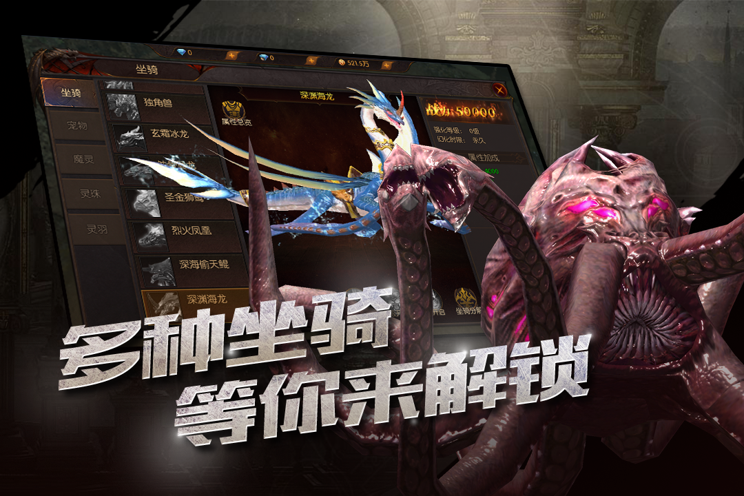 多样坐骑,等你来解锁 - 从威风凛凛的巨龙到神秘莫测的异兽,数十种独特坐骑不仅外观炫酷,还拥有特殊技能助你驰骋战场。