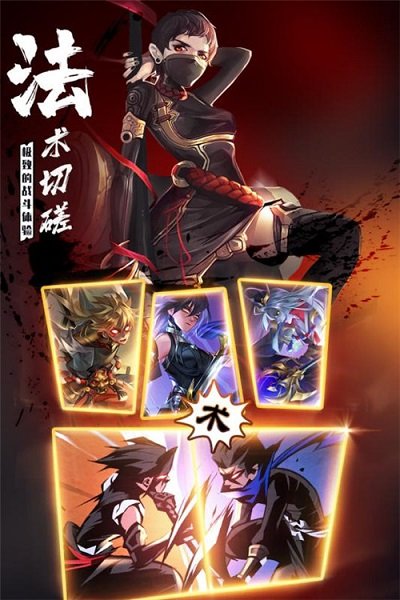 1、一款非常热血的战斗动作卡牌游戏,游戏中拥有超丰富的忍者人物可以收集,组建属于自己的最强小队,告别单一角色体验,任意切换,肆意挥洒