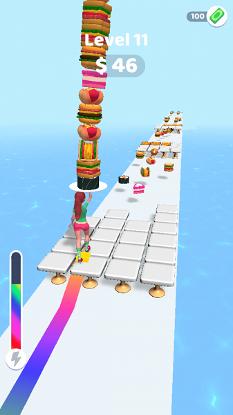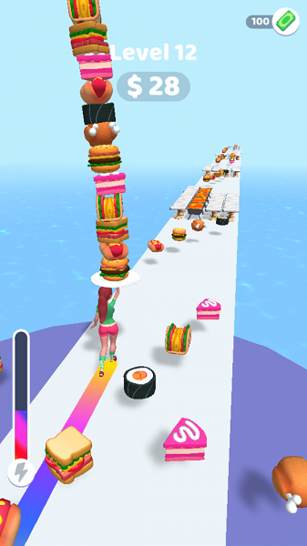 游戏采用直观的虚拟摇杆控制方式,操作手感流畅自然。角色在奔跑时会展现出各种夸张有趣的姿势,为游戏增添了不少幽默元素。玩家可以在保证速度的前提下,通过精准的操作来收集更多汉堡包,创造更高的得分记录。