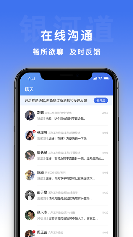 【求职更高效】创新的即时通讯功能支持24小时在线沟通,打破时空限制,让您足不出户就能完成面试洽谈。