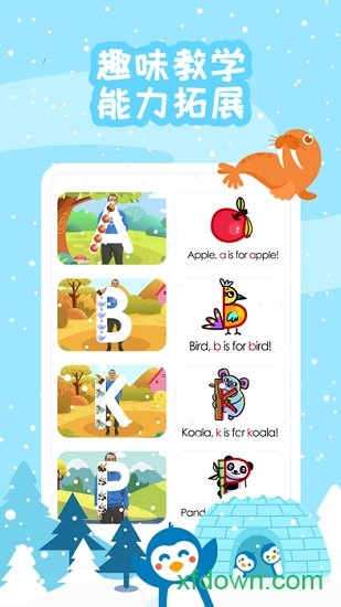 原创动画:色彩鲜明、生动可爱的原创动画及配套插画,帮助宝贝深化词汇记忆,提升学习兴趣。动画内容与课程知识点紧密结合,让孩子在娱乐中学习。