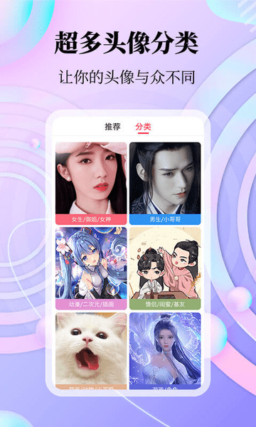 精选了非常丰富的头像素材,而且还进行了详细的分类,帮助用户可以更好的选择。从动漫到真人,从简约到华丽,各种风格应有尽有。