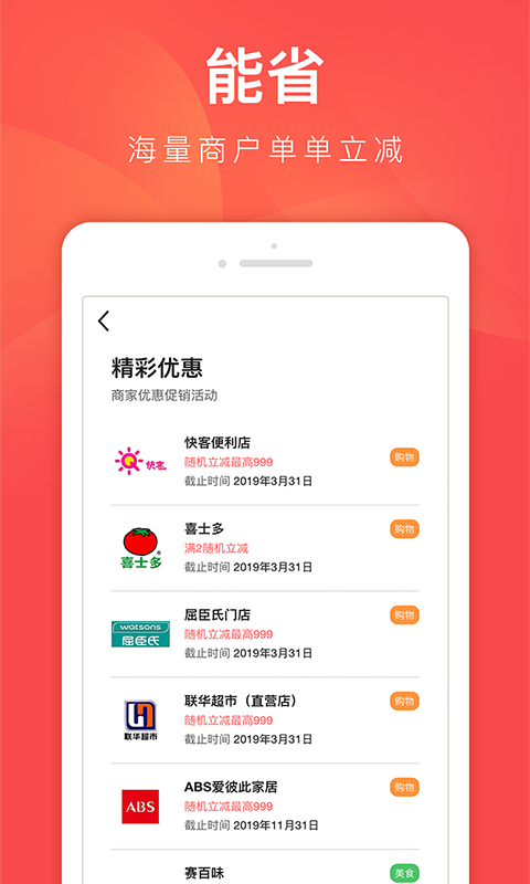 商家优惠:覆盖全国数万家线上线下商户,包括随机返现、首笔消费返现、还款返现等多种优惠活动,同时还可参与云闪付专属优惠,让您享受更多实惠;