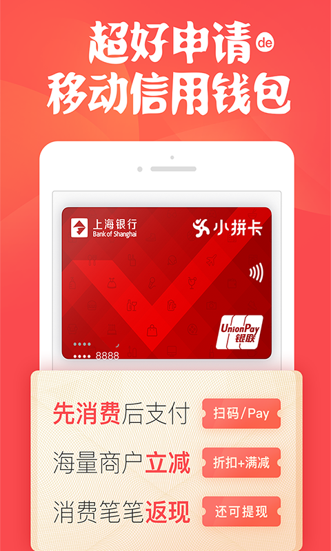 小拼卡是一款功能强大的移动支付工具,支持银联云闪付、二维码支付以及多种PAY绑定功能。它不仅提供先消费后还款的便利服务,还整合了海量商家优惠和返现权益,让您的每一笔消费都能获得额外惊喜。小拼卡与上海银行深度合作,确保支付安全可靠,同时为用户带来极致的支付体验。