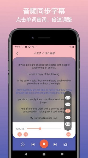 音频同步字幕功能让用户在学习过程中可以随时查看文本内容,点击单词即可快速查询释义,支持英汉、英英词典切换。倍速调整功能允许用户根据自身水平调整播放速度,逐步适应不同语速的英语。此外,软件还提供海量有声书资源,由专业配音演员和大咖朗读,让学习过程更加生动有趣。