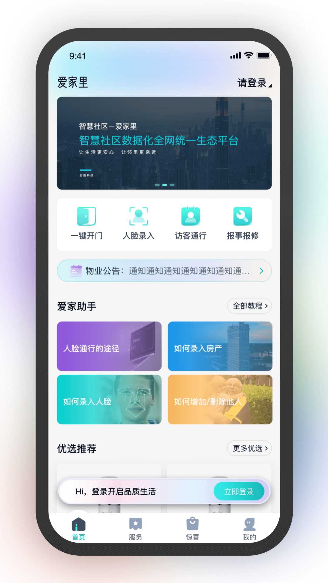 爱家里是一款以提升社区生活品质为核心的智能化平台。平台创新性地融合了人脸识别开门、二维码验证、远程授权等多项门禁技术,同时整合了访客管理系统。通过物联网技术与大数据分析,爱家里不仅解决了传统社区生活的诸多不便,更通过智能化的服务场景设计,持续优化用户体验,让科技成为提升居民幸福感的有效工具。
