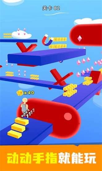 在游戏中,玩家需要收集奶酪块来建造楼梯,这些楼梯将成为你越过障碍物的关键。当你获得奶酪块后,只需点击或长按屏幕就能搭建起通往高处的梯子。这些神奇的奶酪块能让你在空中行走,轻松跨越各种障碍。钻石是游戏中的重要资源,可以用来升级三种实用技能:磁铁可以自动吸引附近的钻石,x2钻石能让收集效率翻倍,穿越障碍则能让你暂时无视部分障碍物。当接近终点时,记得尽量跳到最高的梯子上,因为你的最终得分将与楼梯数量成正比。收集到的钻石不仅可以用来升级技能,还能解锁更多个性鲜明的角色。