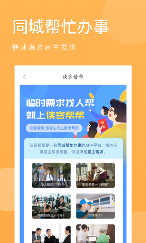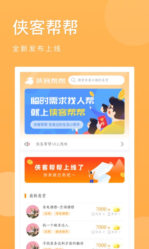 侠客帮帮app致力于打造一个连接雇主与用户的零距离悬赏众包平台。在这个充满江湖气息的平台上,您可以自由选择角色:既可以化身侠客,领取海量悬赏任务,通过完成任务获得丰厚收益;也可以扮演雇主,发布各类悬赏任务,快速找到合适的人选帮您解决问题。平台采用智能匹配系统,确保任务与技能精准对接,让每一笔交易都高效顺畅。