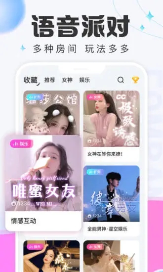 【主题房间】设有女神专场、娱乐互动、兴趣扩列等各类主题房间,满足不同社交需求