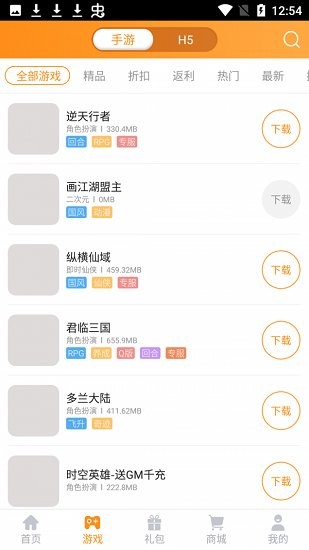 支持通过游戏类型以及满v版,h5版等类型进行查找