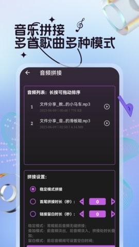 ·【音乐合并拼接】歌曲剪辑拼接一体,一键拼接合并,快来串烧喜欢的歌曲音频吧,支持淡入淡出效果,让拼接处过渡自然流畅。