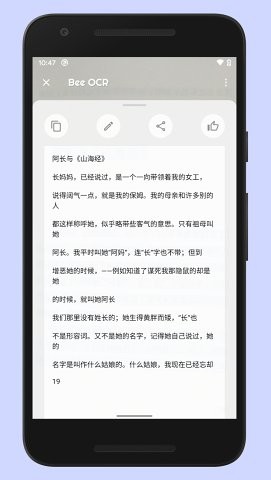 蜜蜂取字是一款功能强大且操作简便的图片文字识别软件,能够帮助用户快速将图片中的文字内容转换为可编辑的文本格式。无论是从相册导入图片,还是直接使用拍照功能,蜜蜂取字都能通过其先进的扫描技术,精准识别图片中的文字信息,并生成清晰可读的文档。软件界面设计简洁直观,即使是初次使用的用户也能轻松上手,大大提升了工作效率。