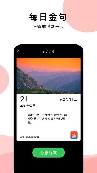 早安祝福相册是维系家庭情感的暖心利器。它不仅能让父母感受到您的孝心,还能在亲友聚会时成为话题焦点。每天早晚定时发送精心设计的问候图片,搭配城市美景和复古风格的背景,让您的祝福永远不重样。特别设计的日签功能融合了心灵鸡汤和现代元素,比传统表情包更有格调。您再也不用担心在家族群里没有存在感,这款应用能让您成为亲友眼中最贴心的那个"福气宝贝"。从清晨的第一声问候到深夜的温馨道别,让科技为亲情加分!