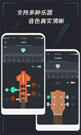 【乐器齐全】支持包括尤克里里、小提琴、吉他、4弦贝斯、5弦贝斯等在内的多种弦乐器,几乎涵盖所有常见乐器的调音需求。