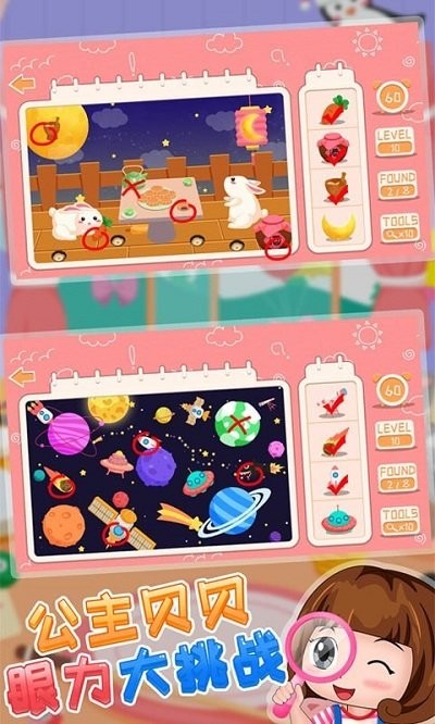 公主贝贝眼力大挑战游戏是一款专为儿童设计的趣味益智游戏,通过丰富多彩的图片找茬玩法,帮助孩子们在娱乐中提升观察力和专注力。游戏中包含多个精心设计的关卡,每关都有独特的画面等待探索,孩子们需要仔细观察并找出其中的不同之处。这款游戏不仅能激发孩子的求知欲,还能培养他们的逻辑思维和手眼协调能力,是寓教于乐的绝佳选择。家长也可以参与其中,与孩子共同体验游戏的乐趣,增进亲子互动。