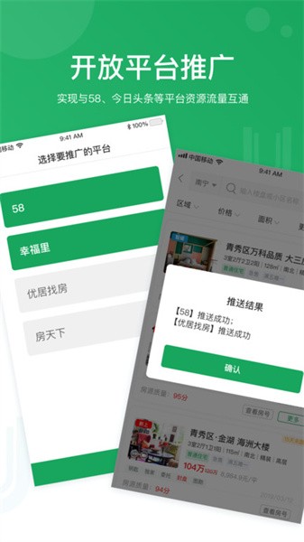 【外部赋能】深度整合58同城、幸福里、房天下等主流房产平台的流量资源,实现房源信息一键多平台同步。配备专业级营销工具包,包含电子传单、VR展示等数字化物料。创新研发的实时佣金结算系统和权证保障体系,确保交易全流程安全可靠。