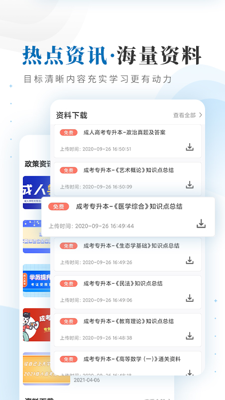 热门咨询实时动态更新,让您第一时间了解成人学习相关信息;海量资料,满足您不同科目学习需求。平台还设有学习社区功能,您可以与其他学员交流心得,分享学习资源,构建属于自己的学习社交圈。