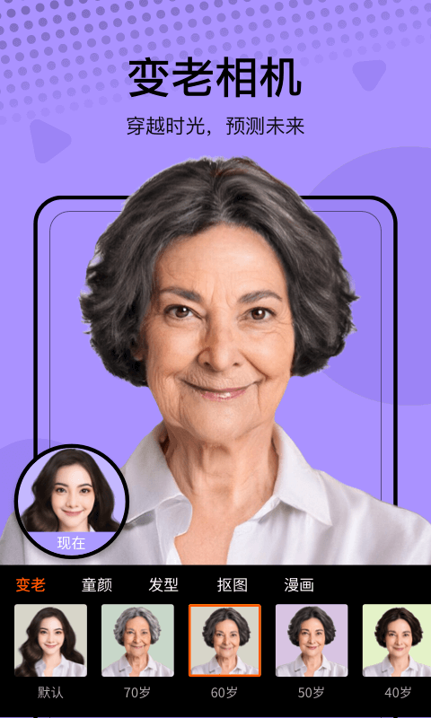 满足用户对未来的好奇心,通过AI算法模拟年龄增长过程。不仅能预览自己变老的样子,还能调整老化程度,看到不同年龄段的面貌变化。